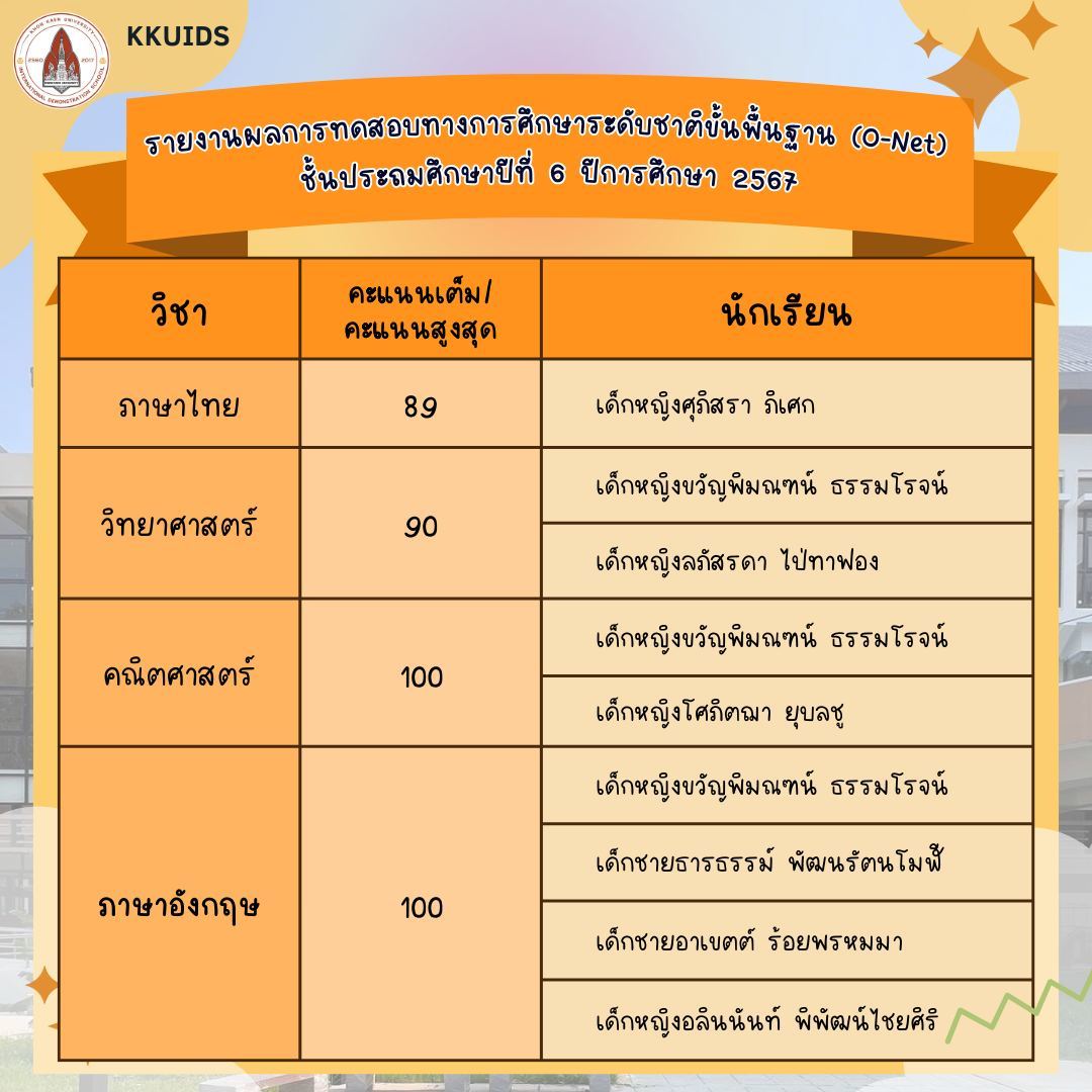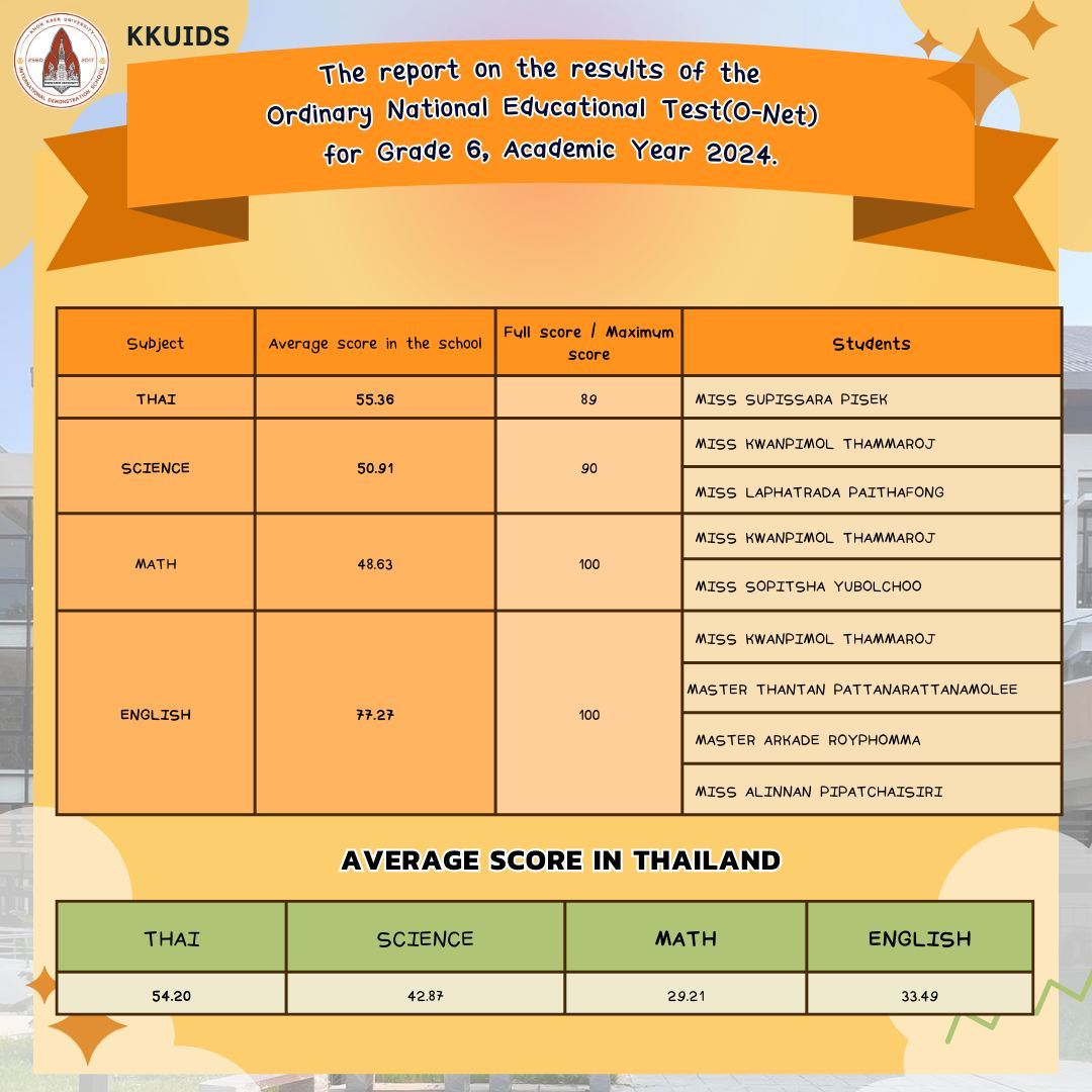 Furthermore, we are proud to announce our school's performance in this year's O-NET examinations: